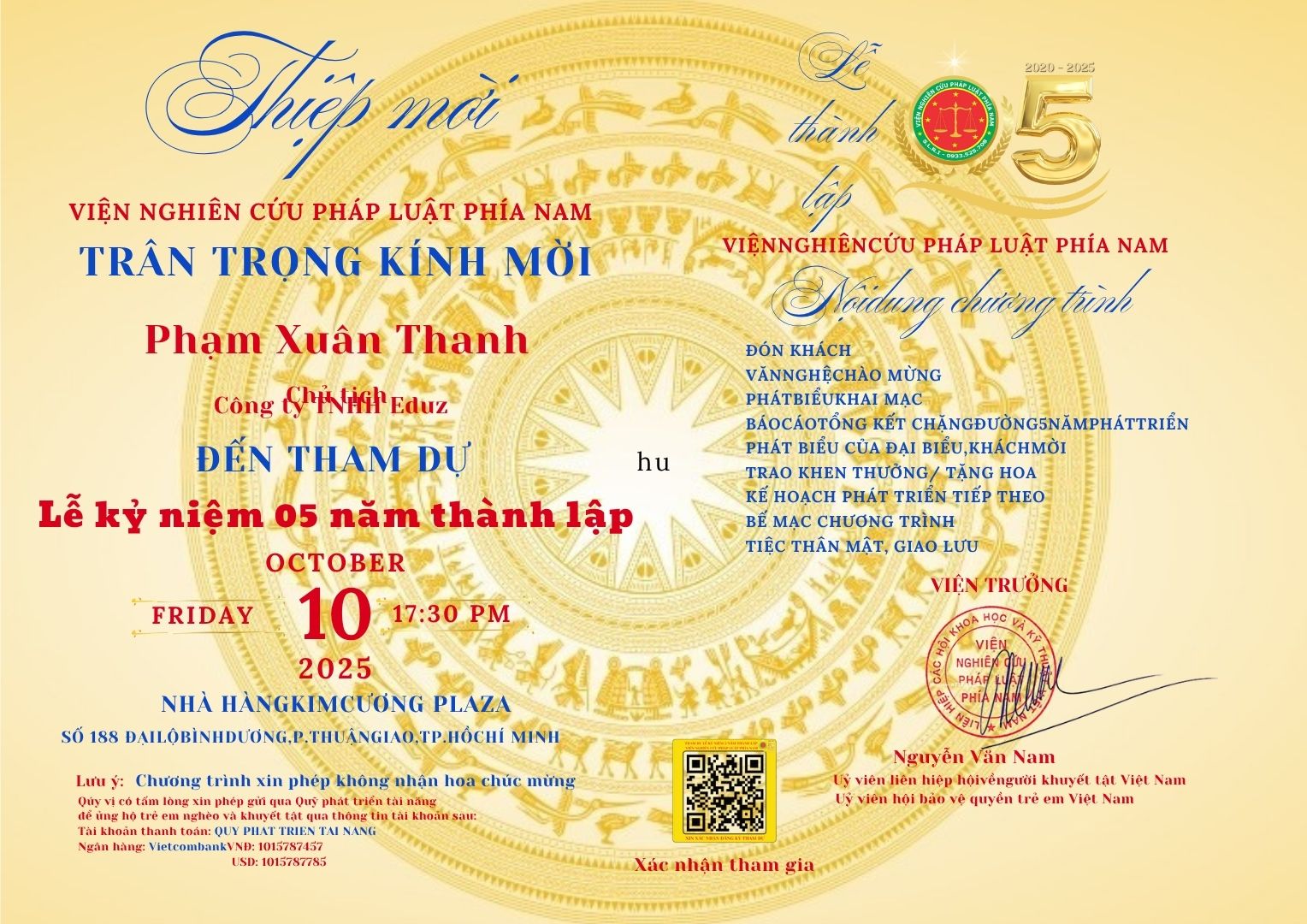 Ngày 10/10/2025, Hệ sinh thái Liên minh đã vinh dự đồng hành và tham dự Lễ kỷ niệm 5 năm thành lập Viện Nghiên cứu Pháp luật Phía Nam – một cột mốc quan trọng đánh dấu hành trình nỗ lực, cống hiến và phát triển bền vững của Viện trong suốt thời gian qua.