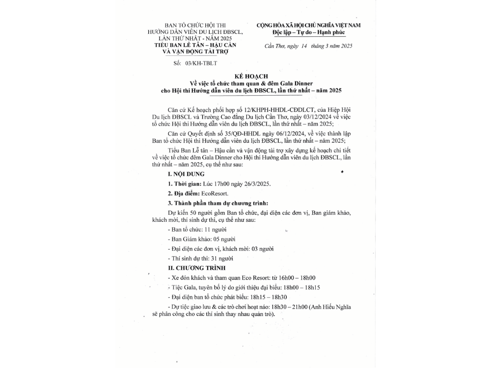 Kế Hoạch Tổ Chức Tham Quan Và Đêm Gala Dinner Cho Hội Thi Hdv Du Lịch ĐBSCL, Lần Thứ Nhất – Năm 2025