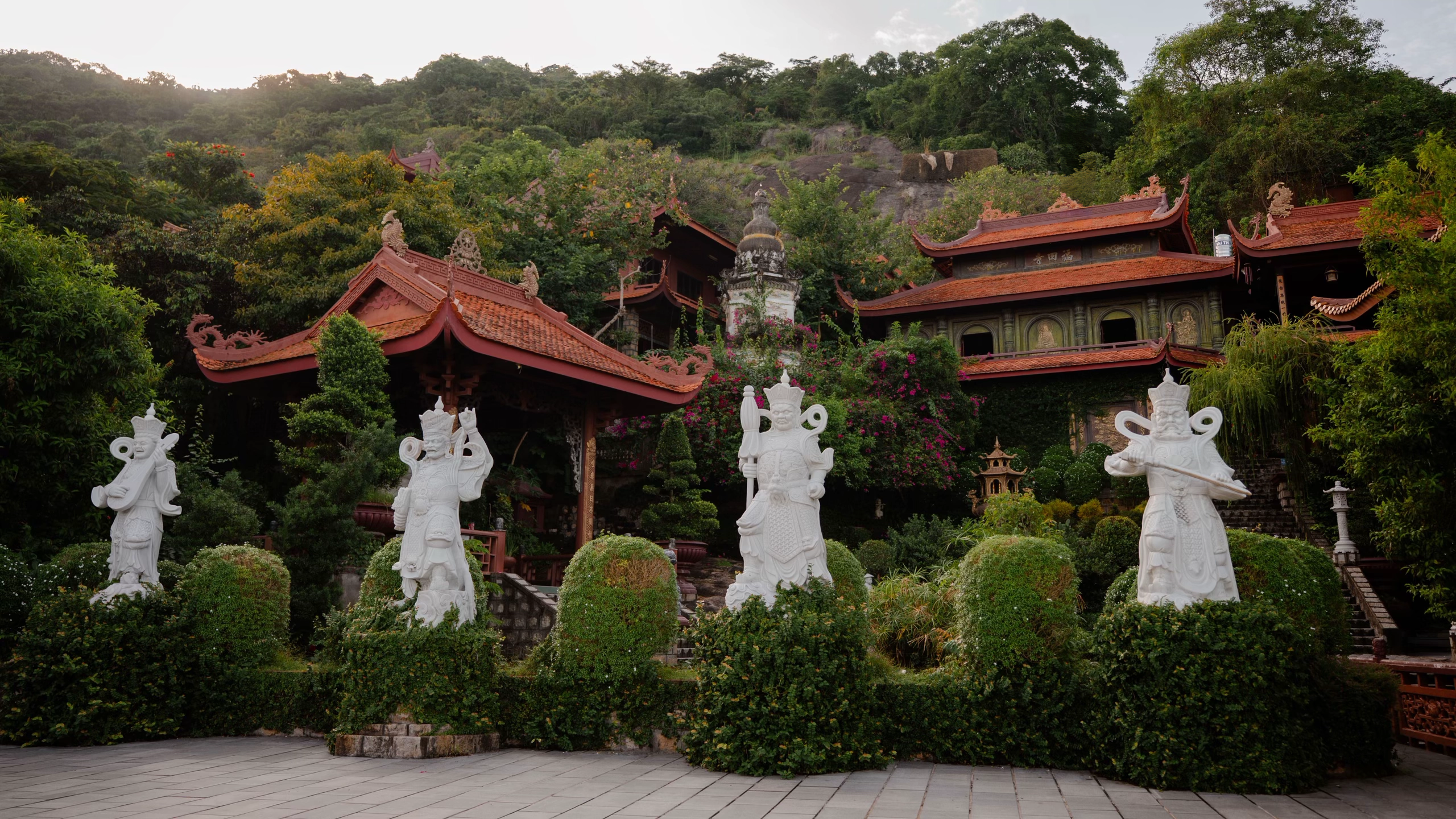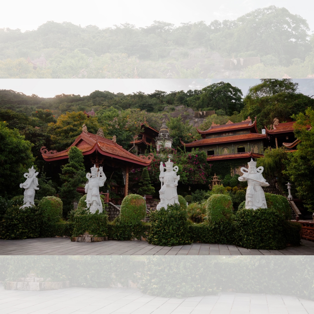 Không gian chùa được bao quanh bởi cây rừng xanh mát, tiếng chim và gió núi làm nổi bật vẻ cổ kính của các công trình. Những lối đá rêu phong, lan can uốn lượn, các chòi nghỉ nhỏ mang lối kiến trúc dân gian Nam Bộ tạo nên cảm giác như đang bước vào cõi tĩnh lặng, thoát tục.