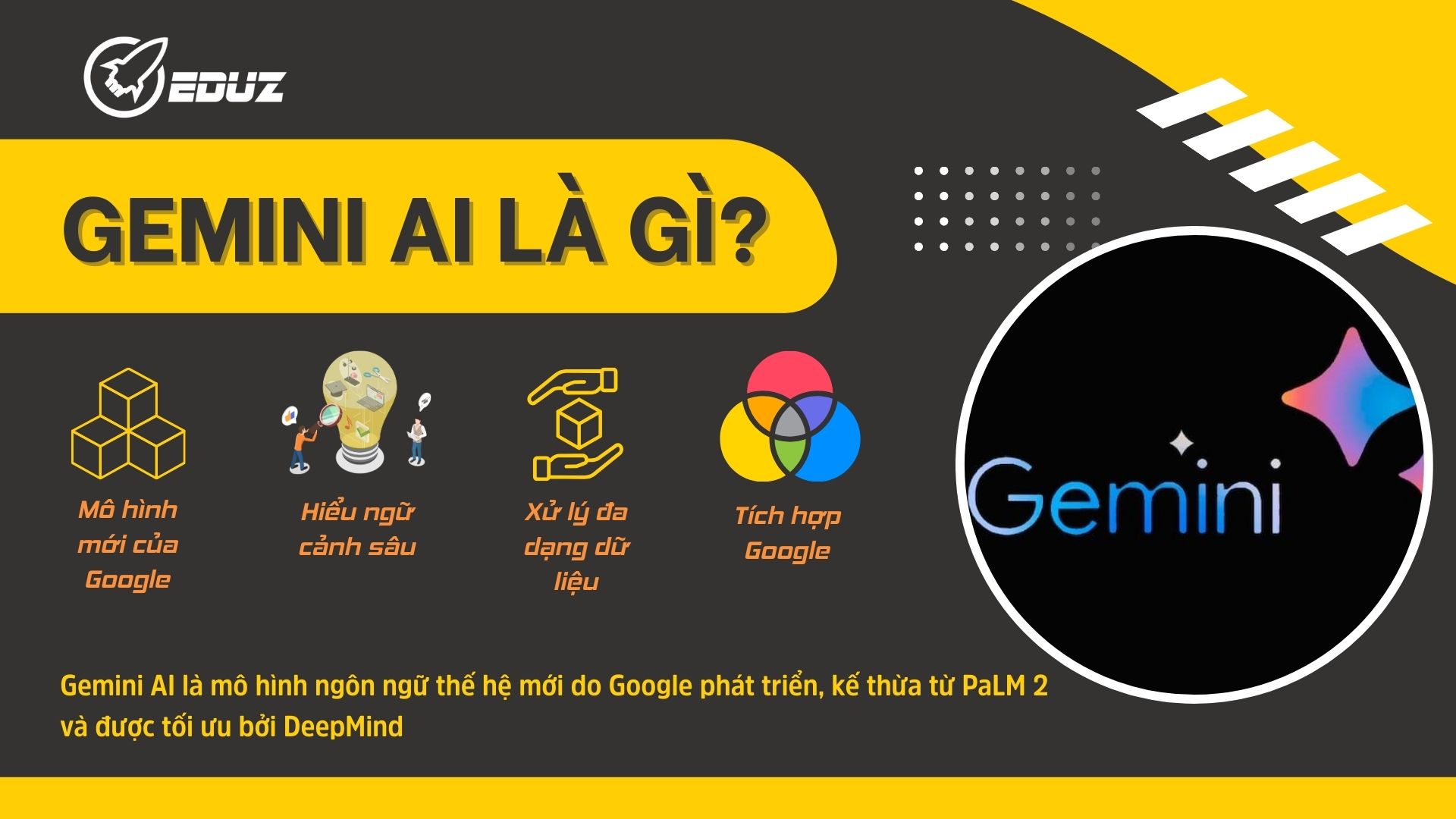 Gemini AI là mô hình ngôn ngữ thế hệ mới do Google phát triển, kế thừa từ PaLM 2 và được tối ưu bởi DeepMind. Điểm nổi bật của Gemini là khả năng hiểu ngữ cảnh sâu, xử lý dữ liệu đa dạng (text, hình ảnh, bảng biểu, PDF) và đặc biệt là khả năng tích hợp trực tiếp với các công cụ Google mà chúng ta dùng hàng ngày.